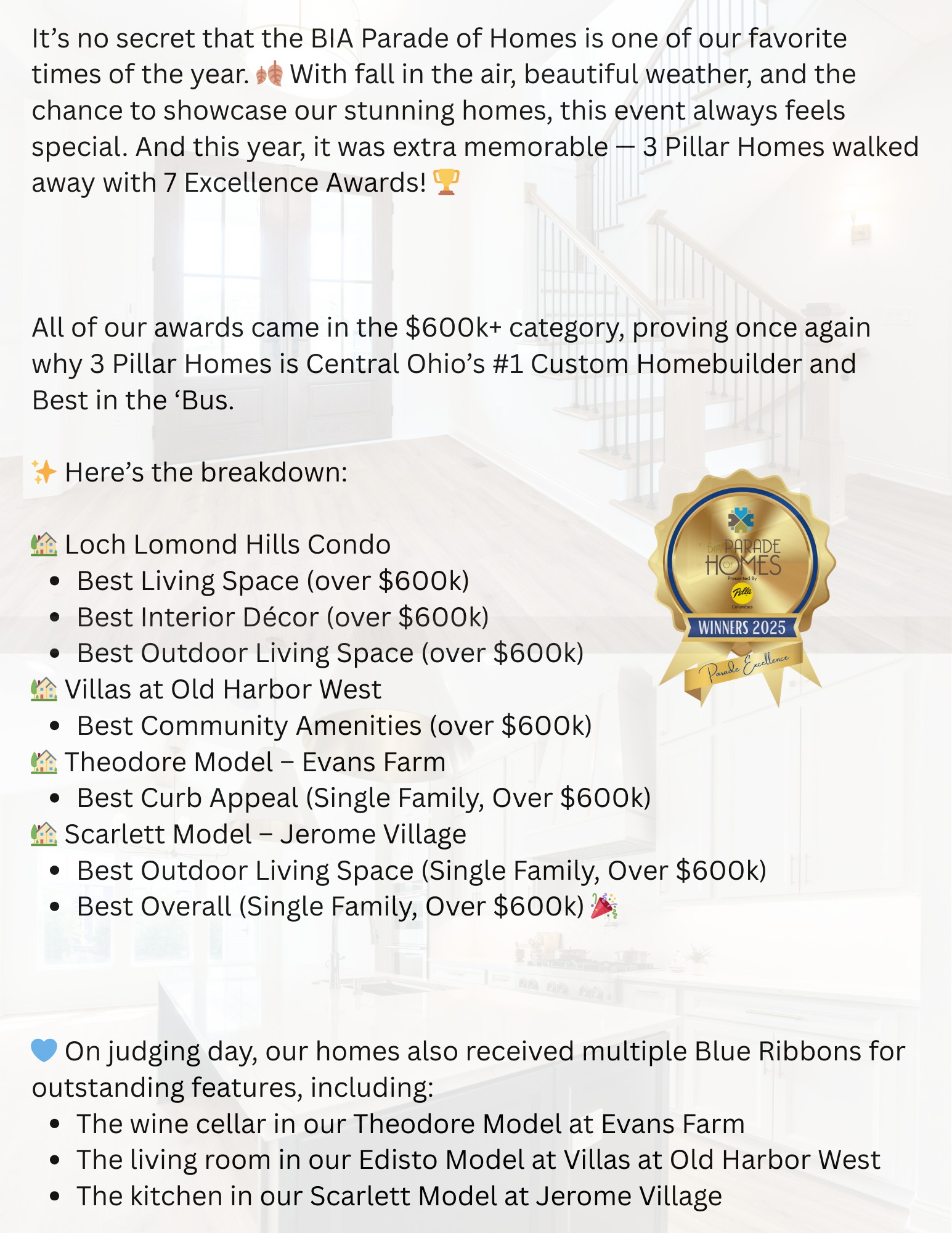 3 Pillar Homes Wins 7 Excellence Awards at the BIA Parade of Homes